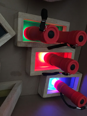 Building with Shapes: In a previous blog post, these rainbow blocks were discussed as a learning opportunity for playing with light, colors, and shadows. They also allowed the children to dialogue about patterns and shapes. Some of the children's language included, "Give me a rectangle." "Let's make a pattern in the wall. Square, rectangle, square, rectangle. That's a pattern." "We are out of [insert shape], what should we use next?"